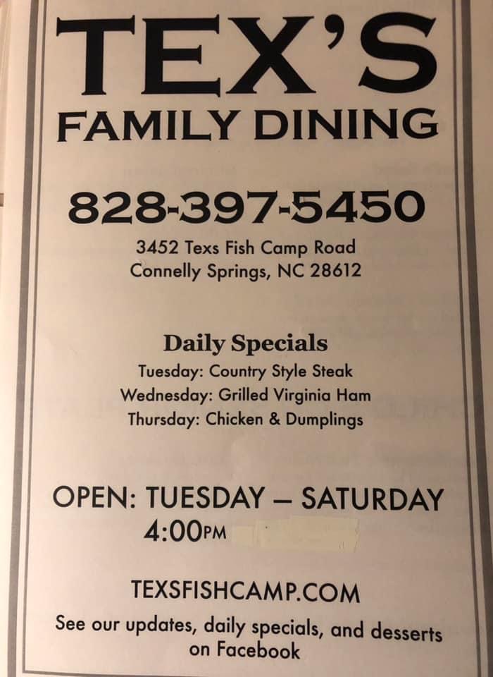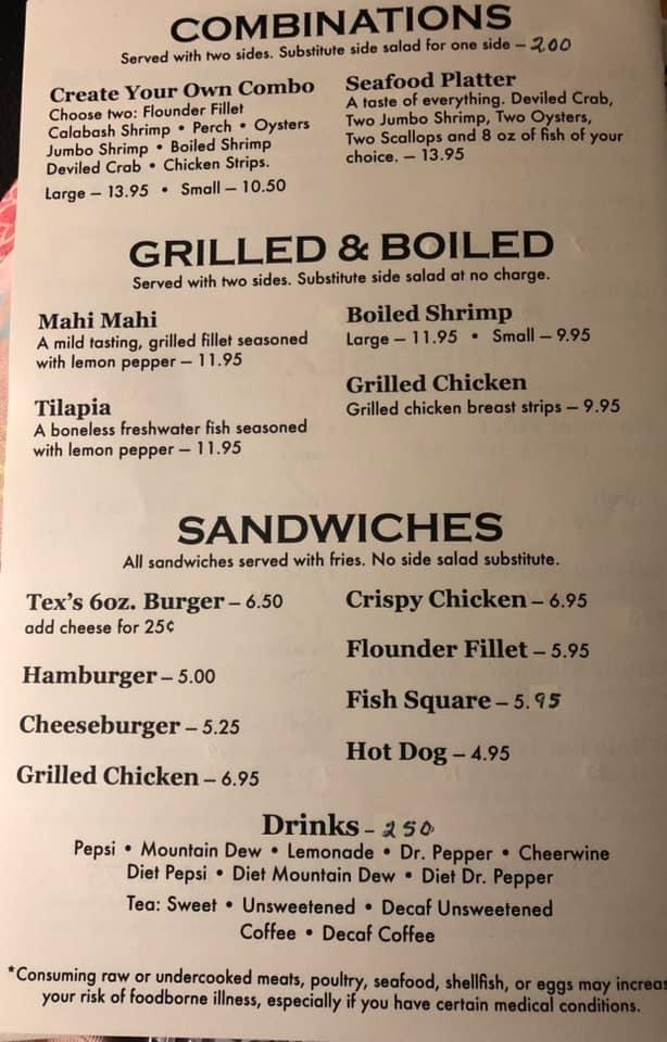 Welcome to Tex's Fish Camp, a beloved family restaurant nestled in Connelly Springs, NC. Known for its warm atmosphere and exceptional service, Tex's captures the essence of quality dining with every dish. The menu features a variety of options that appeal to seafood lovers and land enthusiasts alike.